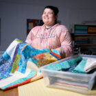 After studying batik fabrics and learning about the process of how batiks are made, students found inspiration in images of water and earth, imagining the cloth laid outside after dyeing. Together, they collected images of summer rainstorms then dissected and abstracted the colors and imagery. Designed by Dora Franks ’23, students learned about the process of improvisational quilting to create a variable composition that allows each quilt to be one of a kind while maintaining consistency. The batiks used for this quilt were sourced from a fair-trade distributor that works with artists in Indonesia to create unique, small batch fabrics.
